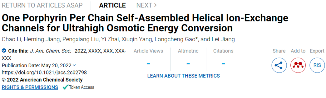 2022年5月20日,Journal of the American Chemical Society 在线发表了Ky官网江雷院士、高龙成副教授团队在高效离子交换膜方面的最新研究成果:“One Porphyrin Per Chain Self-Assembled Helical Ion-Exchange Channels for Ultrahigh Osmotic Energy Conversion”。Ky开元集团博士生李超为第一作者,高龙成副教授为通讯作者,Ky开元集团为第一单位。