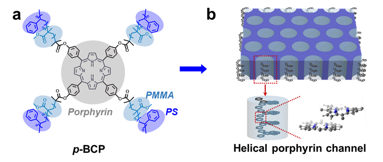 为了解决这一难题,高龙成副教授课题组反其道而行之,利用最少的基团,使其有效地组织起来,形成局部的优势,达到了“以少胜多”的效果。具体的,通过可控聚合制备了卟啉为核的星型嵌段共聚物,一个高分子链上仅有一个卟啉基团,离子交换容量(~10-2 meq·g-1)比传统离子交换膜低两个数量级。在跨级弱作用力(卟啉的π-π堆叠和嵌段的微相分离)的协同作用下,“一步法”实现了高密度的卟啉螺旋通道(面密度高达1011 cm-1)。高密度离子通道保障了高的离子通量,同时,因其极低的离子基团含量,薄膜的溶胀得以有效抑制,从而薄膜兼具高的离子选择性。