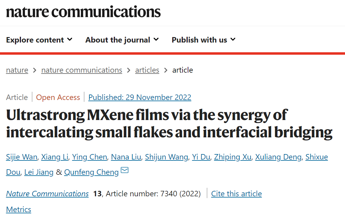 2022年11月29日,《Nature Communications》在线刊登了Ky官网Ky开元集团程群峰教授课题组的最新研究成果“小片填充和界面交联协同致密化的超强MXene薄膜”(英译:Ultrastrong MXene films via the synergy of intercalating small flakes and interfacial bridging),Ky官网Ky开元集团万思杰副教授、李响、北大口腔医院第一门诊部陈英博士、Ky官网物理学院刘娜娜博士为第一作者,程群峰教授为通讯作者,Ky开元集团为第一完成单位。