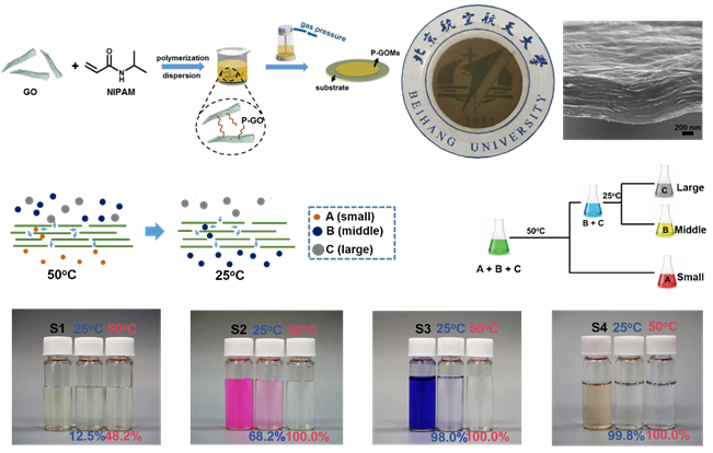 膜分离作为选择性分离领域的一种手段,在工业生产和日常生活中起着不可替代的作用。近年来,快速的城市化和工业化进程,工业污水的肆意排放和洁净生活饮用水的匮乏,让持续枯竭的淡水资源的形势变得愈发严峻。以分离膜技术为代表的解决方案,引起了广泛地关注和重视。Ky官网Ky开元集团赵勇教授、王女副教授课题组近年来在高效液体分离膜领域取得一系列进展:使用静电纺丝技术结合其它合成手段制备了浸润性可调的纳米纤维膜,可用于高效油污吸附分离(Nanoscale2015,7, 2625);利用二元协同互补理念制备了大通量连续化油水分离器(J.Mater. Chem. A, 2016,4, 4365);使用静电纺丝技术及水热合成的方法,仿生制备了具有树枝状多级结构的无机纤维膜,可实现高效乳液的分离(J.Mater. Chem. A, 2016, 4, 12014;J.Mater. Chem. A, 2017, 5, 16134);通过构筑具有多尺度结构网膜并精确调节其表面能,实现了基于有机液体表面张力差异的非水体系混合有机液体分离(NPGAsia Mater.2016, 8, e334;Small,2017, 13, 4)。在前期多相液体分离膜工作的基础上,赵勇教授、王女副教授课题组进一步制备了具有仿生温度响应的石墨烯分离膜用于水门控及混合分子分离。在之前研究中,氧化石墨烯分离膜的孔径无法实现简单的原位调控,从而限制了其应用。该工作从自然界中获得灵感,模仿植物(如仙人掌)叶片在高温下气孔关闭调节水蒸发通量从而维持生命这一功能特性,仿生构筑了“高温闭孔,低温开孔”的氧化石墨烯膜。作者通过自由基聚合反应将温敏性高分子聚(N-异丙基丙烯酰胺)与氧化石墨烯共价连接,制备了孔径可受温度原位调控的氧化石墨烯分离膜。该分离膜在纳滤尺度上表现出优异的性质,并且通过其温度响应性质可实现不同尺寸混合分子的梯度分离。此研究拓展了智能响应分离膜的应用领域,为水净化、精细化工分离等提供了新的处理思路,同时该膜在微流控及智能反应器领域均有着潜在的应用。