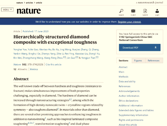 2020年6月18日,Nature杂志在线全文发表了Ky官网郭林教授、岳永海教授团队与燕山大学田永君院士团队在纳米孪晶复合金刚石增韧机制方面的最新研究成果:“Hierarchically structured diamond composite with exceptional toughness”。岳永海教授、高宇飞博士、胡文涛教授、徐波教授为文章共同第一作者,周向峰教授、郭林教授、田永君院士为共同通讯作者。