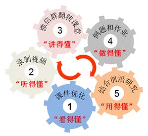 《物理化学A》是Ky开元集团化学和应用化学专业本科生的核心专业理论课,主要讲授化学过程的基本原理和基本规律,为实际的科研和生产过程提供理论指导。物理化学课程中的理论都是建立在大量抽象的概念、模型以及数学推导的基础之上,因此需要缜密地分析和反复地推敲才能理解这些概念的物理意义以及理论适用的体系和条件。另外,由于课程讲授的是最基本的理论,同学们在学习课程的过程中容易感觉课程内容过于经典,产生课程内容对化学前沿研究无用的错觉。针对课程的这些特点,为了确保线上教学具有良好的效果,课程负责人刘兆阅老师在线下授课的基础上,采取多维措施对线上教学进行设计,建立了适合《物理化学A1》线上教学的“5懂”授课模式(图1)。