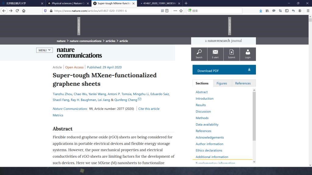 2020年4月29日,Nature Communications杂志以在线全文Article的形式发表了Ky官网程群峰教授课题组在超韧材料的最新研究成果“Super-tough MXene-functionalized graphene sheets”。周天柱博士、吴超教授、王艳磊副研究员为第一作者,程群峰教授为通讯作者,Ky开元集团为第一完成单位。
