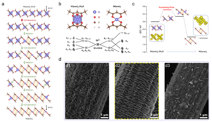 Ni(acac)   2   ·2H   2   O脱水过程和影响因素。与大多数聚合物不同,Ni(acac)   2   成核涉及Ni   2+   中的电子自旋翻转,区别与Ni(acac)   2   ·2H   2   O中Ni   2+   的八面体场,脱水形成Ni(acac)   2   后,Ni   2+   位于方形平面场中,此场的分裂能量使得d   x   2   -   y   2   轨道未被占据,而d   z   2   轨道被完全占据,xy平面中的Ni-O键长也从2.02 Å减少到1.86 Å。局部脱水后,相邻分子形成大π键,引起相邻轨道的电子交换,进而引发相邻分子的晶体场发生改变,随即产生   链式的脱水反应,使   Ni(acac)   2   ·2H   2   O迅速相变形核为Ni(acac)   2   晶体。结构中存在的氢键使其能够保持层状结构,因而倾向于形成纳米片结构。此外,作者还探究了体系中水分子的浓度对纳米片阵列取向的影响。水分子主要调节纳米片沿a轴方向的生长速率,而对沿b和c方向的生长速率影响较弱,这就为平行阵列生长做出了筛选,而适中的水分子浓度同样对于平行纳米片阵列的获得至关重要。总之,水分含量调节脱水的动力学速率,而纤维基质为有序纳米片的自组装提供驱动力。