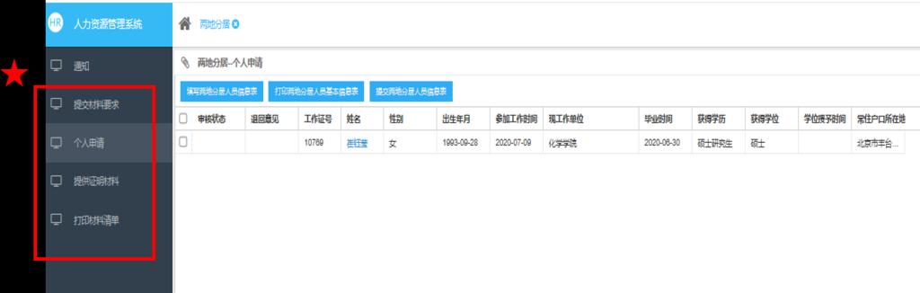 教职工进入系统后,可点击“提交材料要求”选项,查看材料要求。点击“个人申请”选项,可填写、打印、提交两地分居人员信息表;点击“提供证明材料”选项,可下载打印各类证明材料模版;点击“打印材料清单”选项,可填写、打印材料清单。具体详见下图: