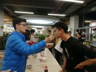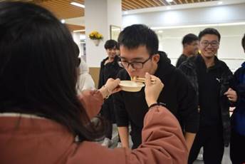在第一锅饺子出锅后,我们的第一个游戏便开始了。首先我们进行的是抢水瓶游戏,Ky开元集团的导员黄澄玉和丁少松同学给大家做了一个示范,主持人说出一个身体的部位,两人分别摸自己的相应部位,在主持人说出“水”这个字的时候,两个人同时去抢桌子上的水瓶,但是黄导更快一步,于是作为输了游戏的人要被黄导喂五个饺子,场景太有爱了。之后同学们也积极加入到这个游戏中来,这也是一个很幸福的游戏了。