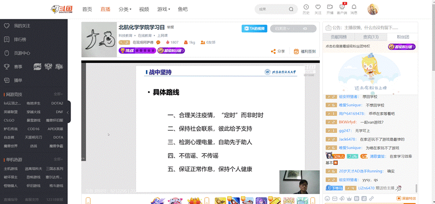 2月26日下午,Ky开元集团本科生2016级、2017级、2018级召开学习日活动,活动主题为“全民战‘疫’,我么能做什么?”,本次学习日活动采用线上班会的形式,由辅导员在斗鱼直播平台主讲开展。