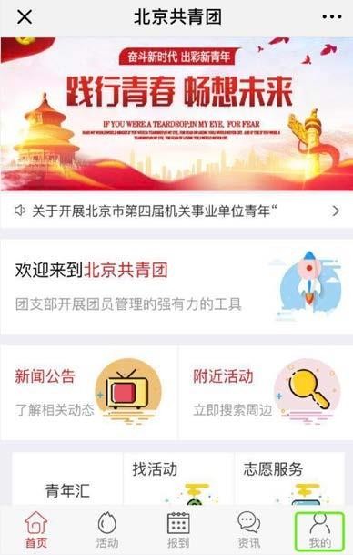 团员用户通过青春北京菜单栏进入系统后,点击我的按钮。